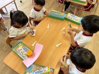 年少組さんは指先を使って折り紙をちぎり、のりで貼りました。のりはどのくらいつけようかな、どこに貼ろうかなとたくさん考えて作りました。