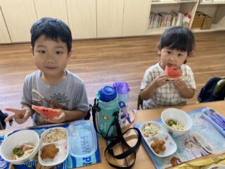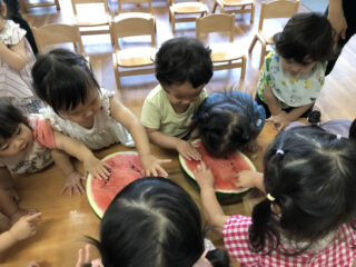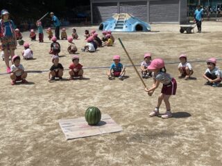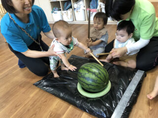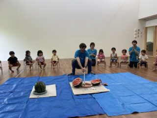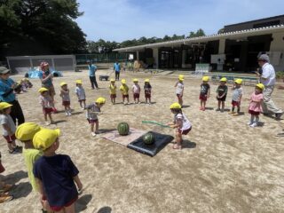 夏らしいお天気の中、すいかわりを行いました。大きなすいかを目の前に、子どもたちの目はキラキラ輝いて期待も膨らみました。