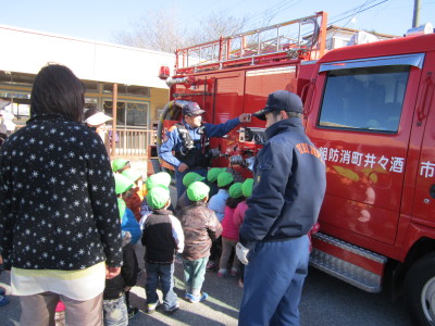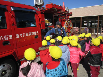 訓練終了後、年少さんとおひさまくらぶさんは消防車見学を行いました。