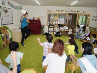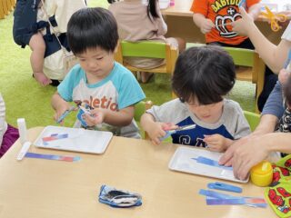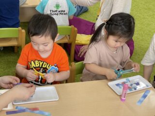 お家でやったことのあるお友だちも、今日が初めてです!というお友だちも、先生の切る様子をじーっと見て、自分でもはさみを使ってみました。