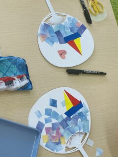 切った紙をうちわにペタペタ貼っていくと…海のうちわになりました!