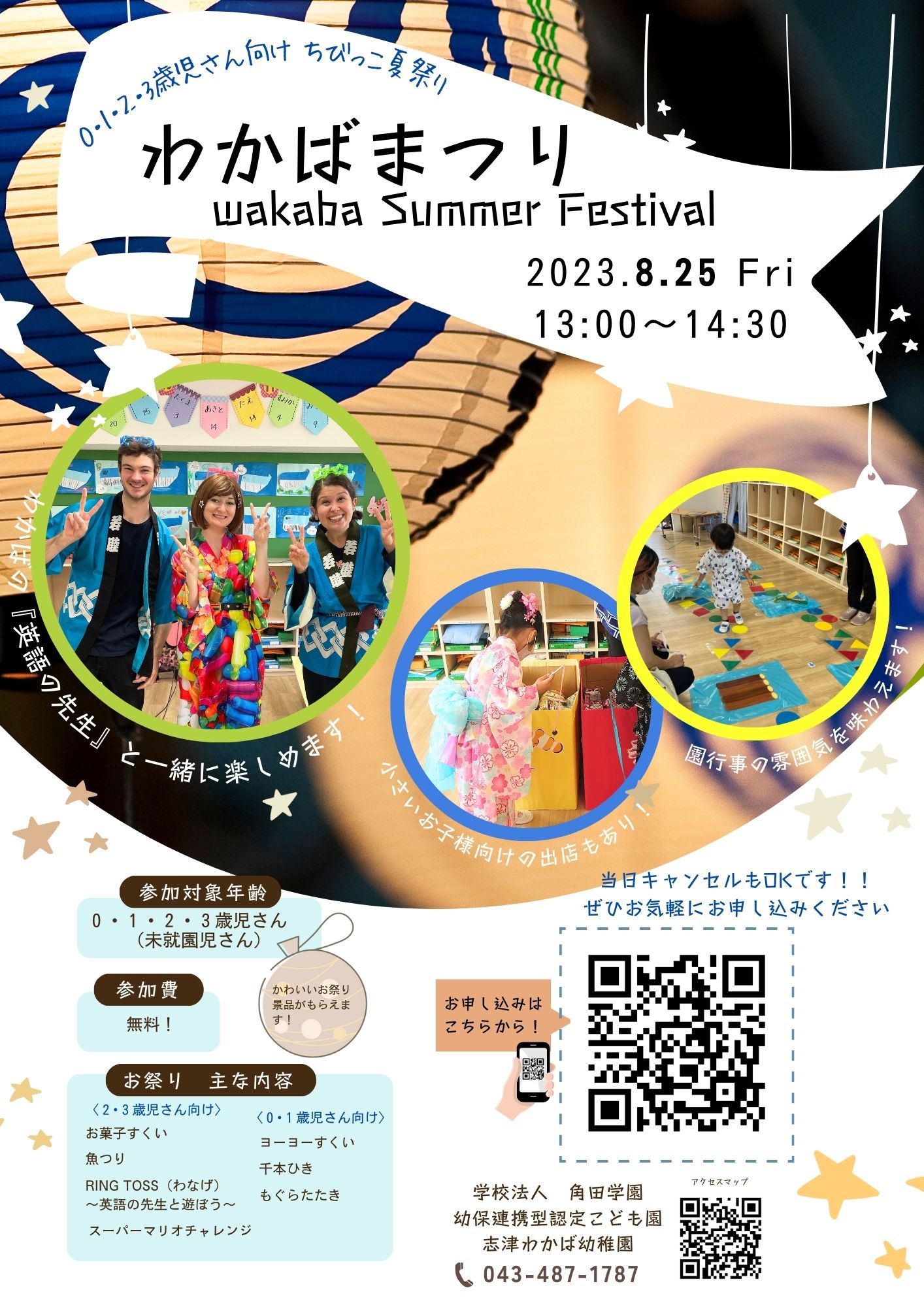 そして今年は「こども園」として新しく生まれ変わったわかば幼稚園を、地域の未就園児さんたちとそのご家族の方にも広く知っていただきたいと思い、未就園児さんたちを『わかばまつり』にご招待いたします。夏の楽しい思い出づくりにぜひいらしてください。