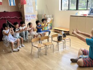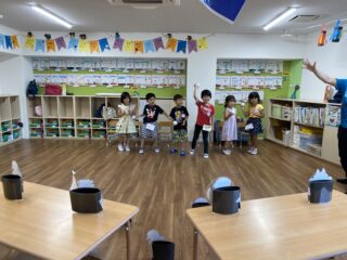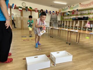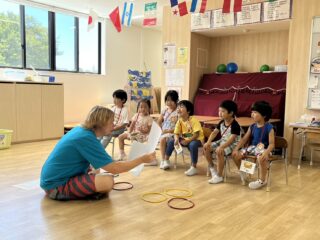 初めは緊張している様子も見られましたが、外国人の先生のお話を真剣に聞き、真似をしたり触れ合うことで少しずつ仲良くなり、英語に親しみを持って過ごすことができました。