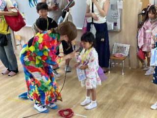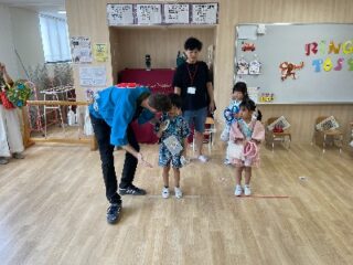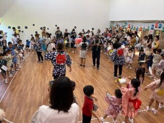 夏ならではの浴衣や甚平姿で、お家の人と一緒に各保育室でいろいろなゲームに挑戦して景品をもらったり、お遊戯室で盆踊りをしたりして楽しく過ごしました。