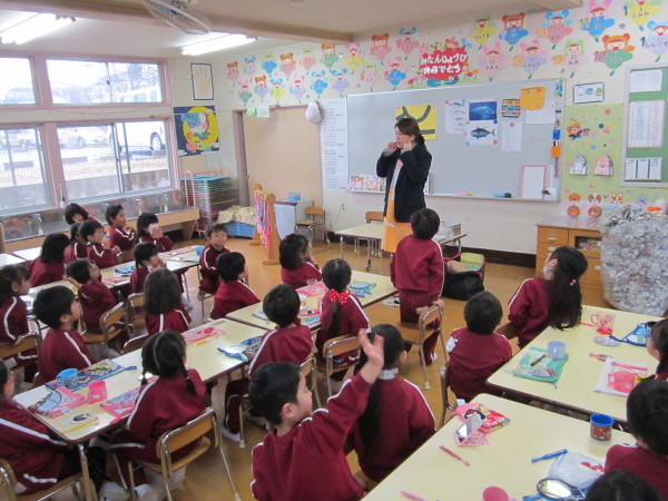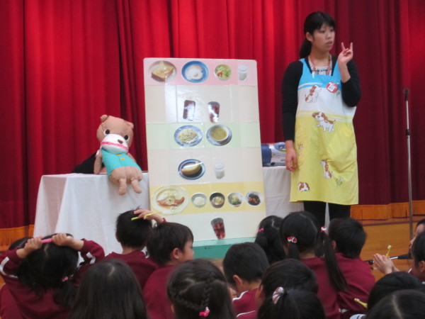 まずはお遊戯室で歯の大切さや、正しい歯みがきの仕方、虫歯にならないためにはどうしたら良いかなどのお話を聞きました。子どもたちの中には歯の生え変わりが始まっている子もいるため、みんな興味を持って話を聞くことができていました。