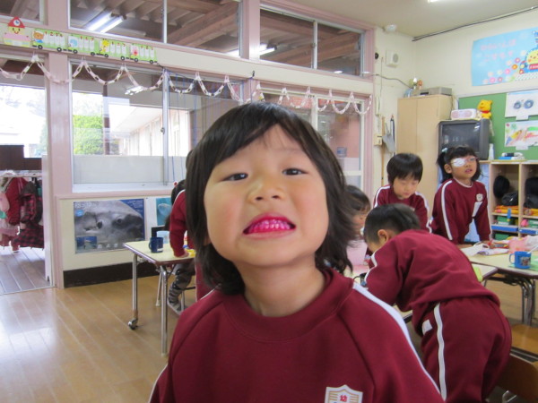 お部屋に戻ってからは、歯の染め出しを行いきちんと歯が磨けているかの確認をしました。歯がピンク色になると、子どもたちは大興奮でしたが、歯科衛生士さんに『濃いピンク色が残っているところは、まだバイキンが残っているところだよ』と言われると、持参した手鏡を見ながら、一生懸命磨いていました。