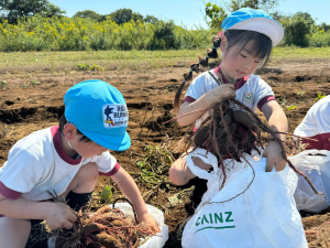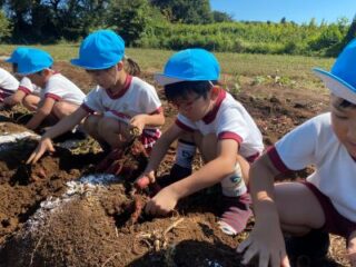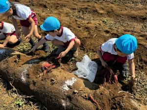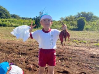 畑に着くと張り切ってお芋を掘り始めました。さすが年長さん!たくさんの土をかきわけて、自分の力で一生懸命お芋を掘るができていました。いろいろな形や大きさのお芋が取れると、お友だちとうれしそうに見せ合う姿が見られました。
