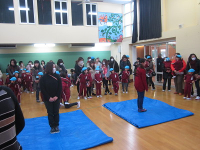 ブルーシートを大きく広げた上に、親子で各クラスみんなで乗りました。どんどん小さくなっていくブルーシートの上に、どれだけ多くの人数が乗れるかを競い合いました。初めはみんなの間に余裕があったのですが、ブルーシートが小さくなるにつれて身を寄せ合ってギュウギュウになりながらみんなでブルーシートの上に乗りました。