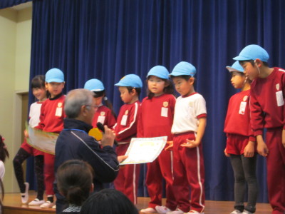 最後に、どのクラスも賞状とメダルをもらいました。子どもたちは、「キラキラしててきれい!!」「この色可愛い!」などもらったメダルに大満足でした。