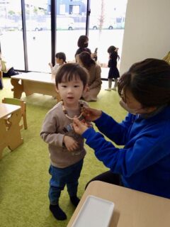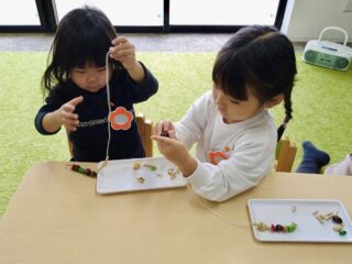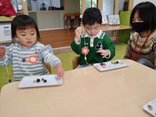 「緑は…?」と、クリスマスカラーに興味をもち、先生の見本の様子をじっと見た後、自分の力でひも通しをやってみました。
