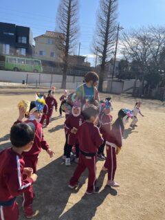 つぼみ組、つくし組、3歳以上児クラスは自分で作ったお面を被り、園庭で豆まきをしました。ドンドンと太鼓の音が鳴ると、怖い顔をした鬼がやってきました。追いかけてきたり、驚かせてきたりして中には泣いてしまう子どももいましたが、負けじと「おにはーそと!」と豆をまくことができました。
