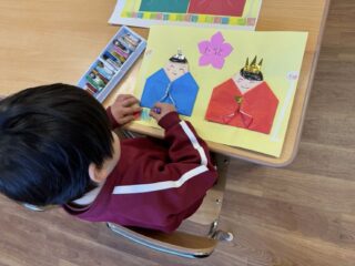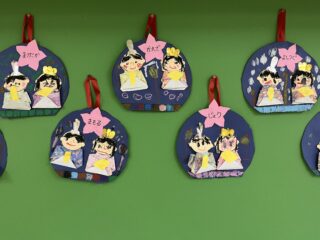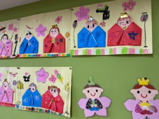 学年で、おひなさまの制作を行いました。折り紙で着物を折ったり、工夫して表情を描いたりして、かわいらしい作品ができました。
