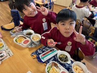 給食の時には、ひなあられを食べました。みんなで大きくなったことをお祝いすることができました。