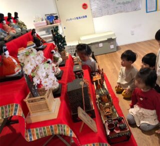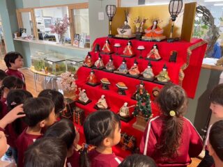 幼稚園の職員室前には大きなおひなさまを飾りました。お内裏様やお雛様だけでなく、三人官女や五人囃子など様々な人形をじっくりと観察していました。
