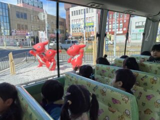 ちょっとドキドキしながら、おうちの人に「いってきまーす!」と手を振り、先生と子どもたちだけで幼稚園バスに乗っておさんぽに出かけました。