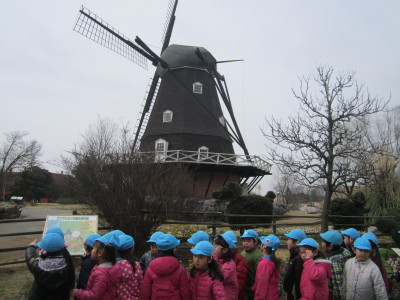 散策をし、大きな風車を見に行きました。歩きながら、たくさんのきれいなお花も見ました。