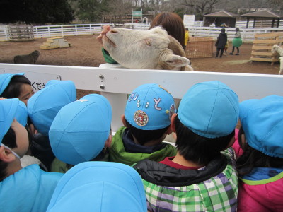 アンデルセン公園ではふれあい広場で動物を見ました。ヤギやポニー、うさぎやモルモットなどの可愛い動物を見ました。ヤギが近くまで来ると「キャー!」と驚いていました。