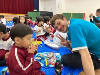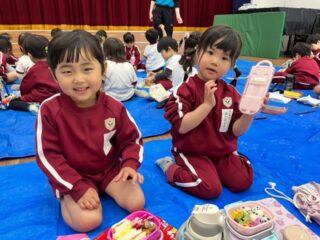 幼稚園に戻り、お遊戯室でお弁当を食べました。たくさん遊んでお腹もペコペコになり、おうちの人が作ったお弁当に大喜びの子どもたち。友だちと「おいしいね!」とおしゃべりしながら楽しく食べました。