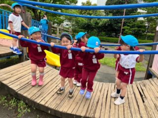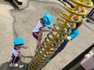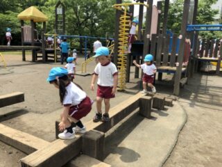 公園に着いて約束事を確認し終えると、大型遊具めがけてうれしそうに走って行きました。アスレチックやすべり台、ゆらゆら揺れる橋など幼稚園にはない遊具がたくさんあり、顔が赤くなるまで思い切り体を動かして遊んでいました。