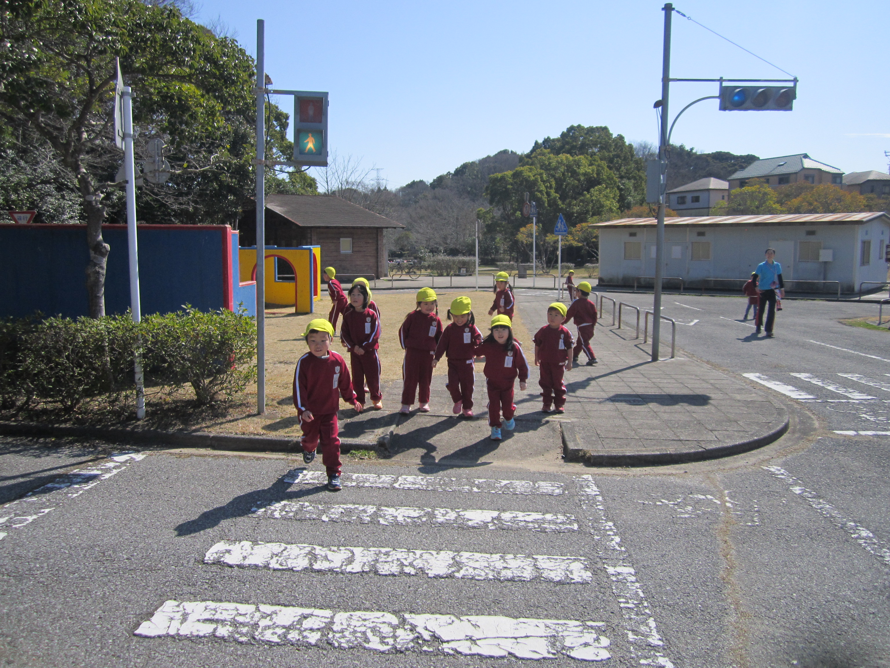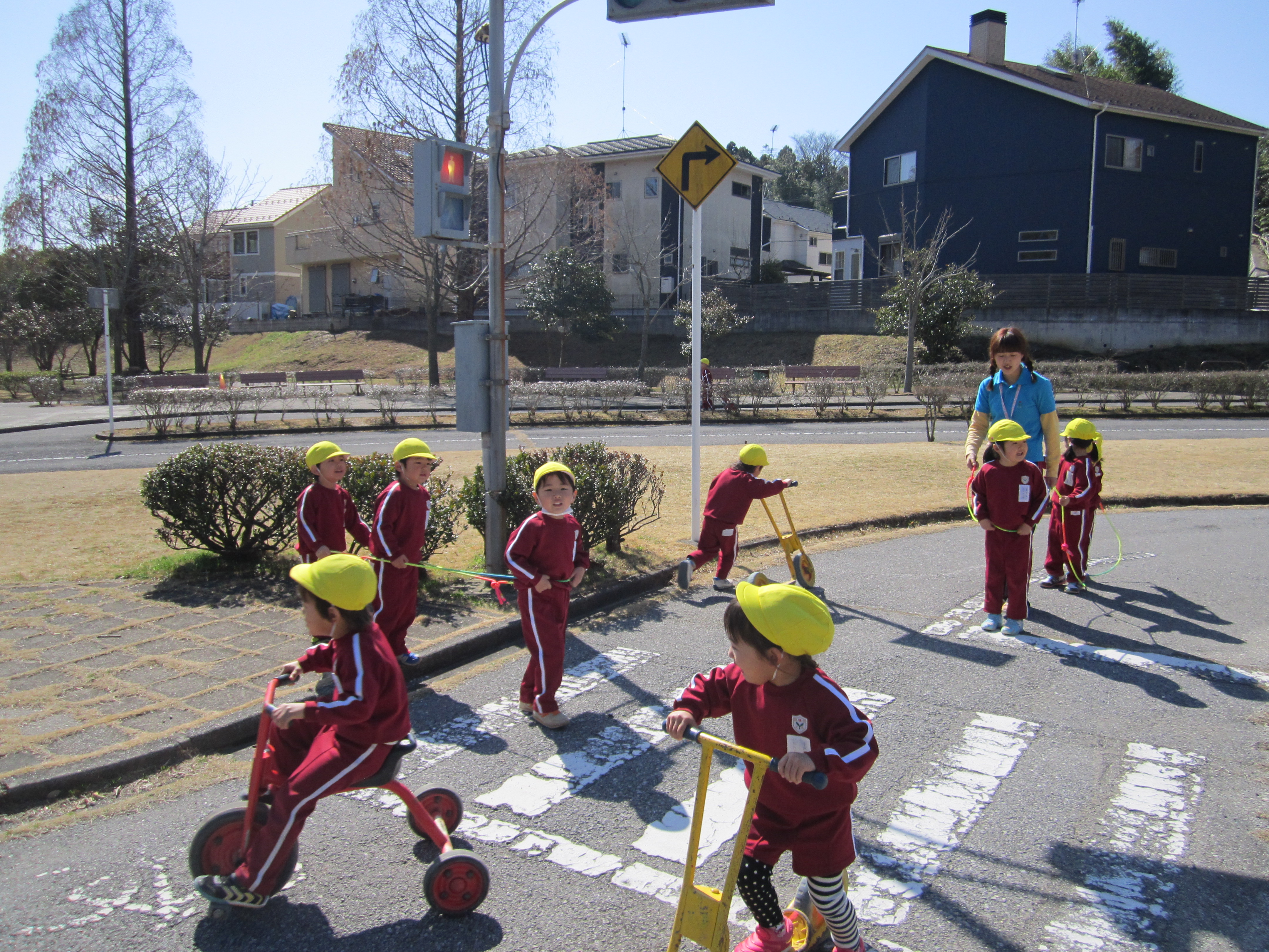 まず始めは、交通公園で遊びました。信号や横断歩道などがあり、信号が変わると「青だから進もう」「赤は止まれだよ」と教えあったり、お友だちとスクーターや電車ごっこをして楽しんでいました。
