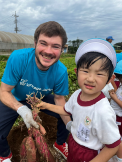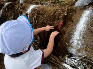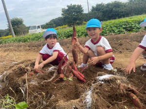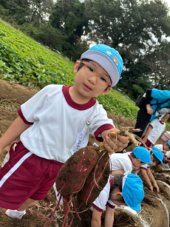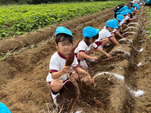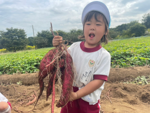 畑では、幼稚園でのお芋掘り練習の成果もあり、自分の手で一生懸命掘っていました。お芋が見えると、「見えた!」「お芋が大きいよ!」など、うれしそうな声がたくさん聞こえてきました。