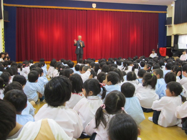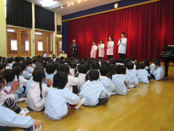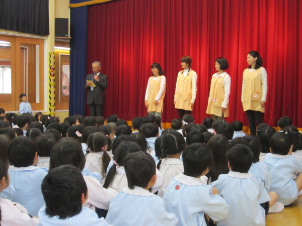 始業式では園長先生からお話をいただき、「1つ大きい組になったので、これから入ってくる年少組さんにはやさしくしてあげましょう。」との言葉に、「はい!」とたのもしい返事をしていました。