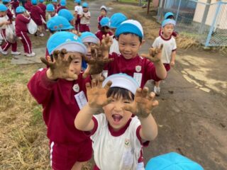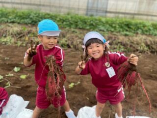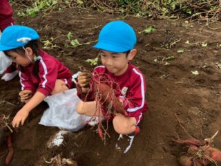 1つの根からたくさんでてくる芋に大興奮で「うんとこしょ、どっこいしょ」と力いっぱい掘ることができました。友達の掘った芋と見比べながら「丸くてゴツゴツだね、ネギみたいに細いね!」など様々な形に興味津々の様子がありました。大きなお芋がお家に帰ってどのような料理に変身するのか待ち遠しくしているようでした。