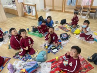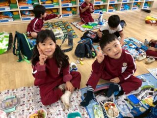 天気が不安定だったため、幼稚園に戻りクラスでお弁当を食べました。お家の人が作ってくれたお弁当に大喜びの子どもたちは、友達と一緒に大事そうに食べお腹いっぱい、大満足の1日となりました。