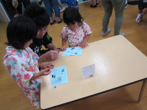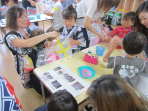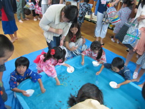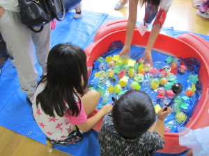 <きんぎょすくい> 光るおもちゃが入ったきんぎょを「どれがいいかな?」「これがいい!」と、おたまで嬉しそうにすくい上げていました。年長さんは本物の金魚すくいもして楽しみました。