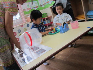 <ヨーヨー作り> 鈴の入った袋をふくらませ、大きなヨーヨーを作りました。おうちの人と協力し、頑張ってテープを付けて、上手に作ることができました。