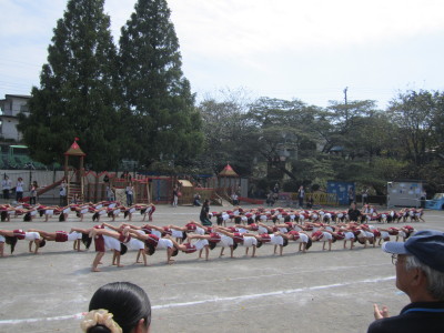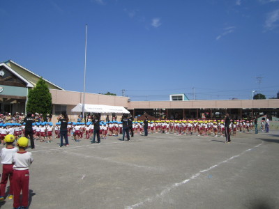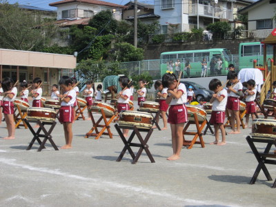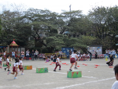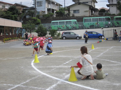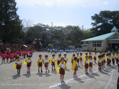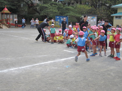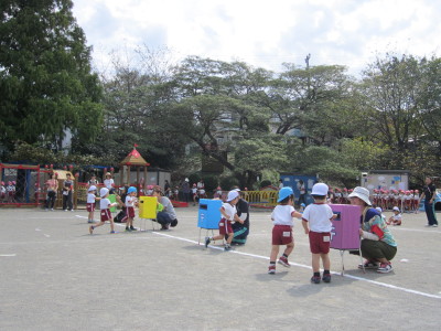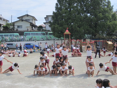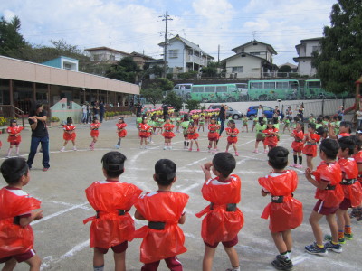 年少組はかけっことお遊戯。年中組はパラバルーン・お遊戯・かけっこ。年長組は組体操・リレー・和太鼓を行い、