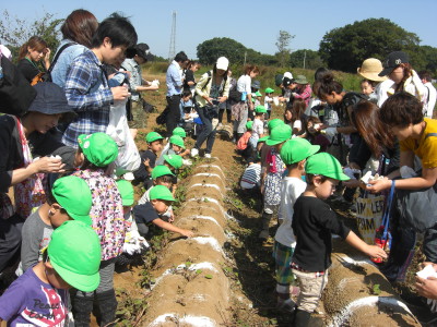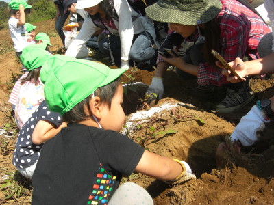 幼稚園で手でシャベルの形を作って掘る練習をしておいたこともあり、畑では自分で上手に掘ってお芋をみつけることができました。いろいろなところから、おうちの人と子どもたちの「ここだよ〜」や「もっと掘らなきゃ!」など、楽しそうな会話がたくさん聞こえました。細いお芋や、大きいお芋が出てきて、とてもうれしそうでした。