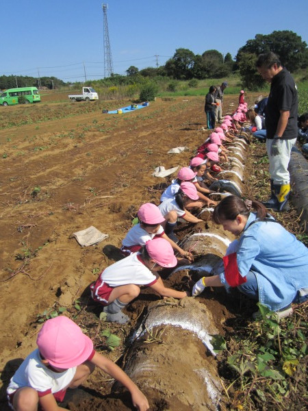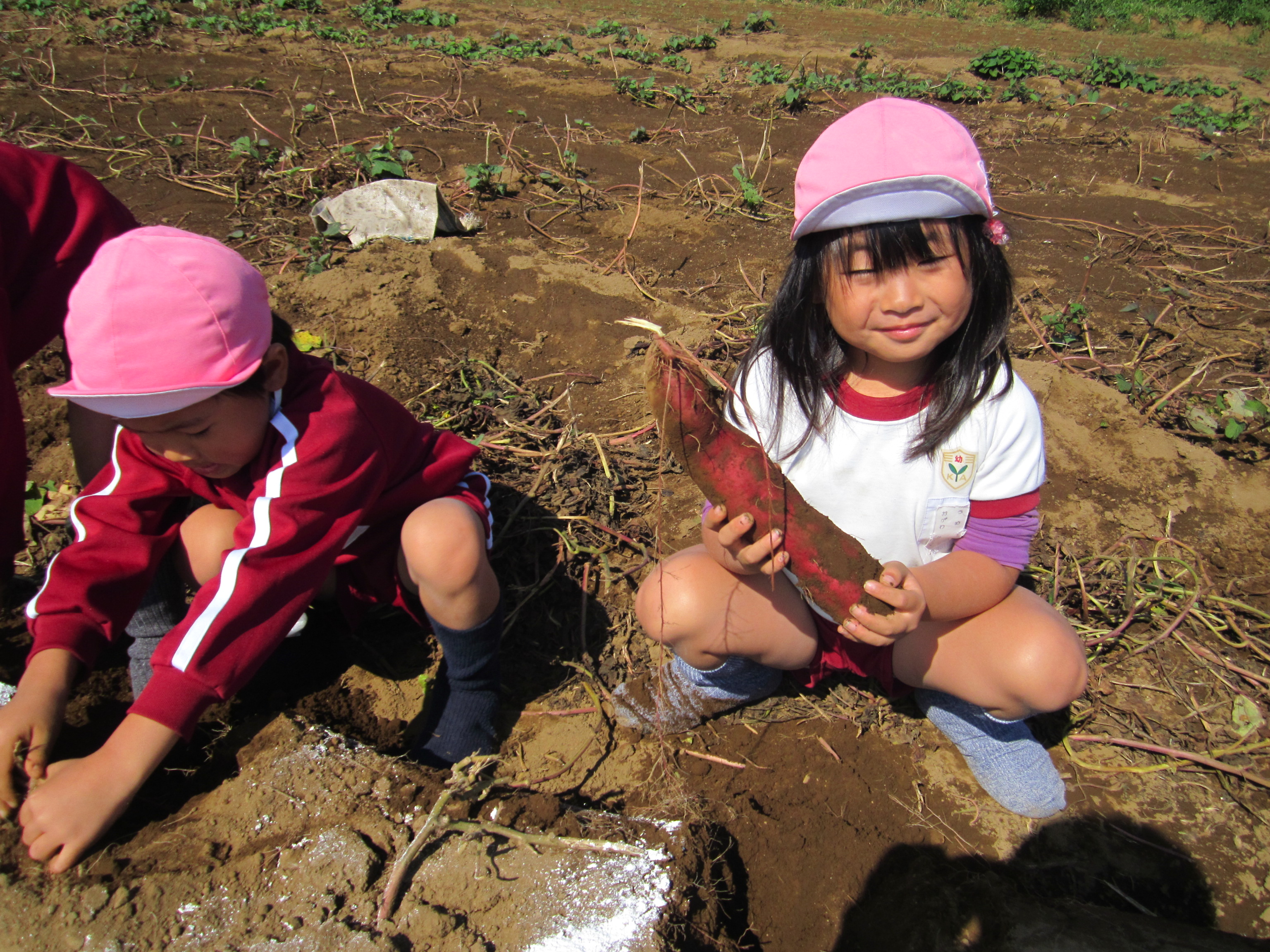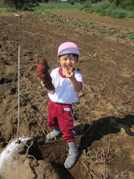 畑に着くと早速張りきる子どもたち。両手で一生懸命土を掻き分けて、お芋を見つけると『あったぁ~~!』と大興奮。次々出てくるお芋に子どもたちは大喜びで、お友だちや先生に見せていました。