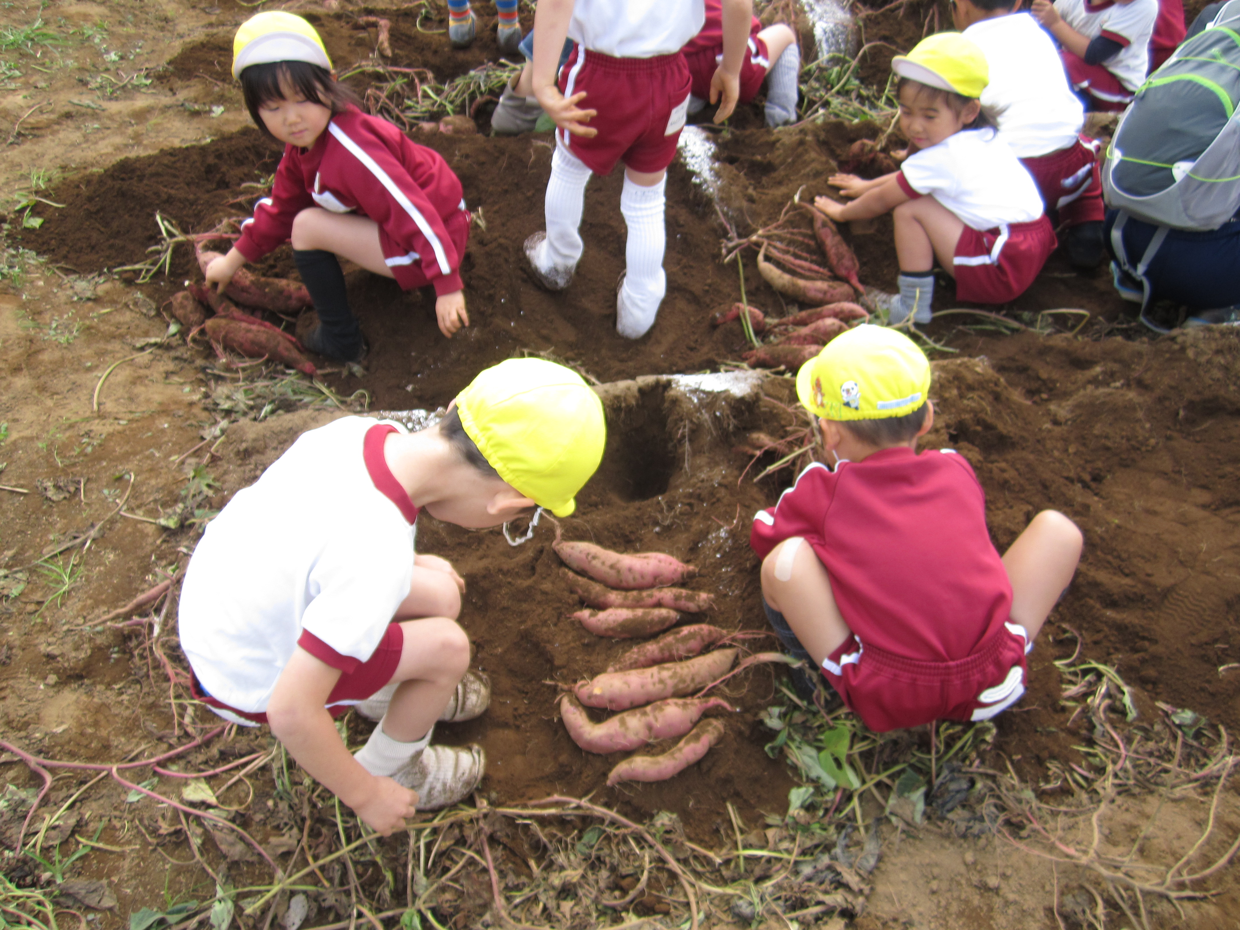 お芋掘りがスタートすると夢中で掘りますが、今年のお芋は根が深く、なかなか手ごわい相手だったようです。しかし苦労して掘り出したお芋の重さは格別で、「おもすぎる〜」「ふとっちょすぎる〜」と、あちこちからうれしい悲鳴が響いてきました。