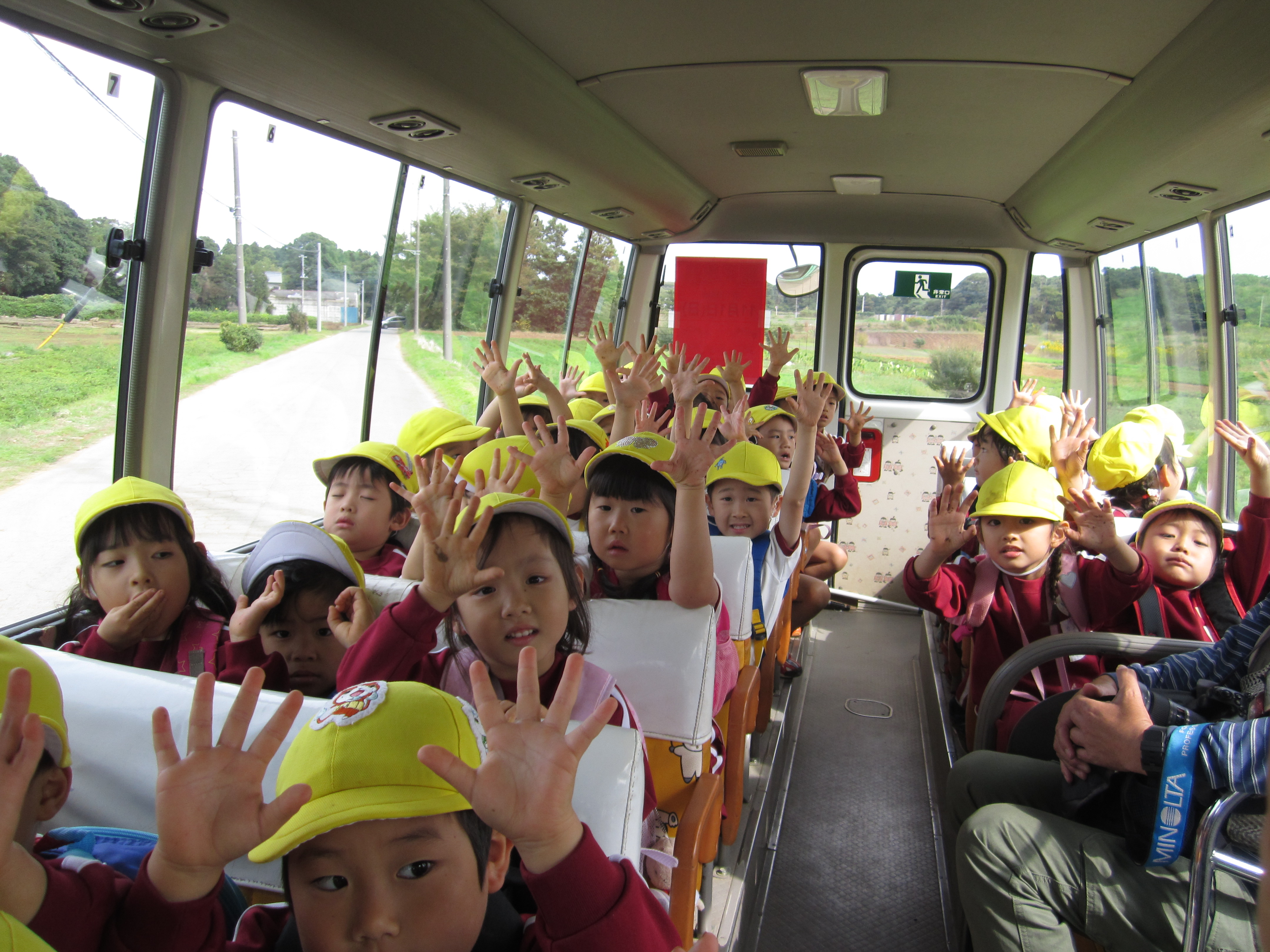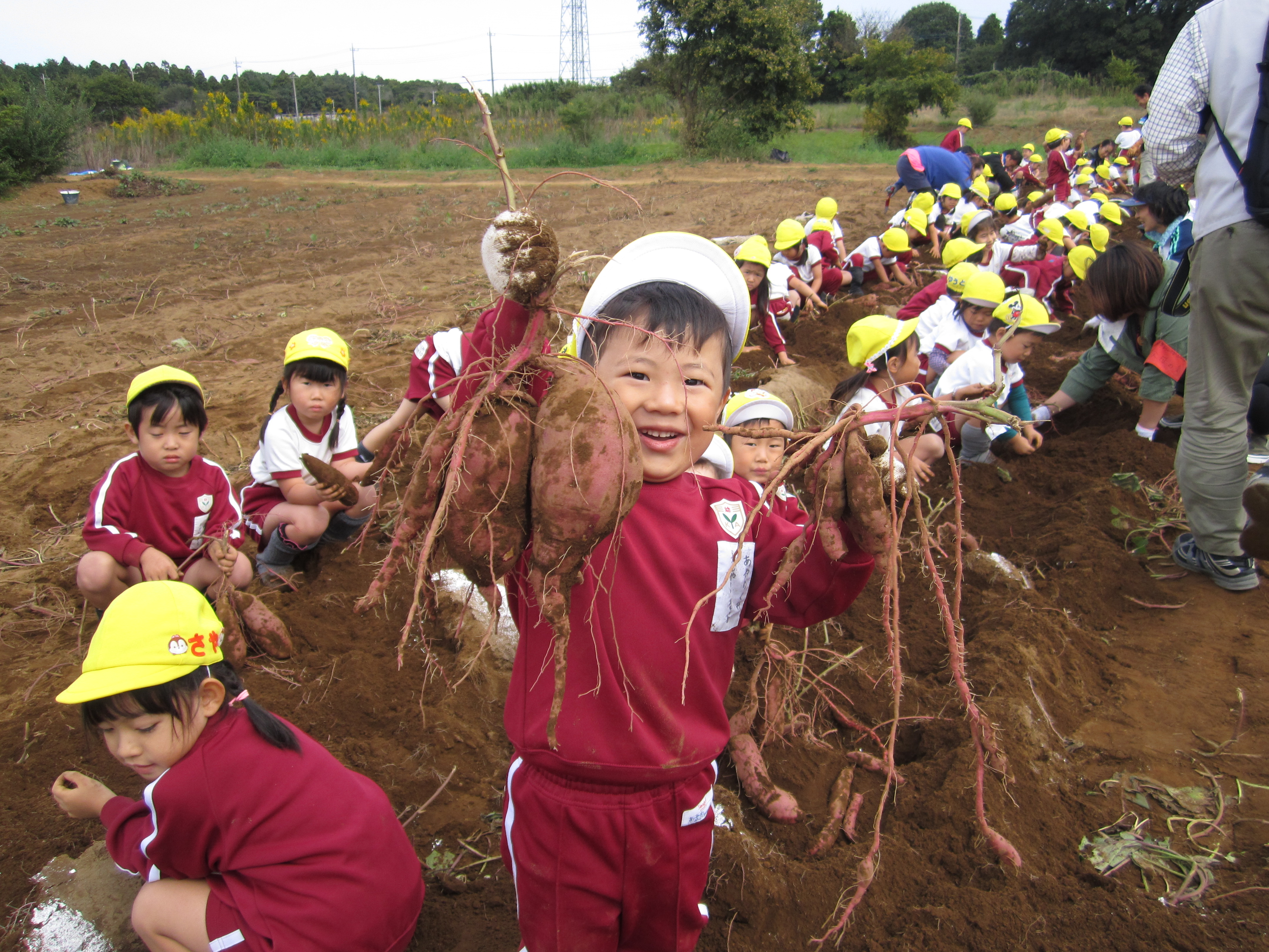 子どもたちは他学年の友だちがお芋掘りに行く姿を見て、期待をたくさん膨らませていました。今日は、ばら・あやめ組で張りきってお芋掘りに行ってきました。