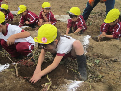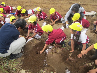 張り切って掘り始めた子どもたち。お芋の頭が少し見えると「出てきた!」と大喜びしたのもつかの間、