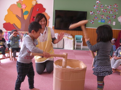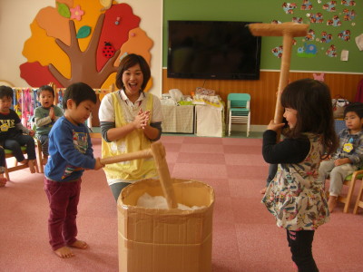 12月に入り、在園のお兄さん、お姉さんの近くで一緒におもちつきごっこをしたり、寒さに負けず遊んでいます。