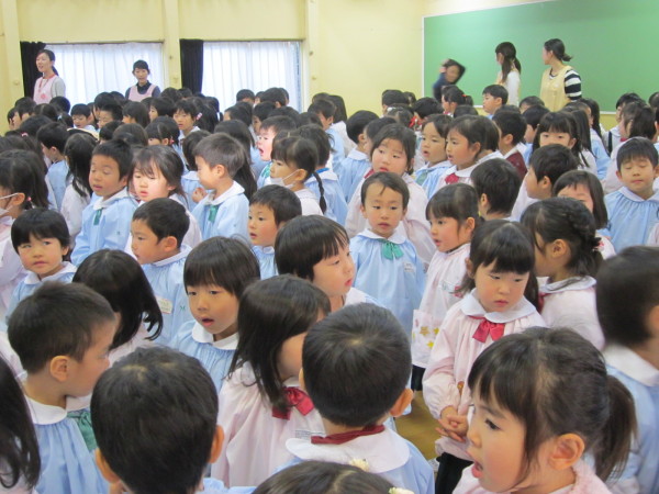 今日の終業式でも、子どもたちは園長先生から頑張ったことや成長したことをたくさん褒めてもらい、とてもうれしそうでした。また、冬休みの約束事のお話も2つ聞きました。