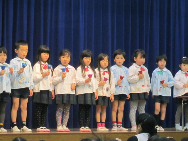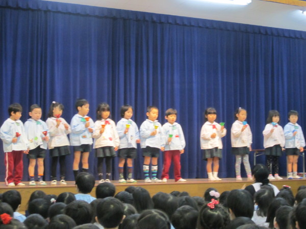 式の最後には、課外保育『わかばクラブ』をやっている年長さんによるハンドベル演奏が披露されました。年少さん、年中さんも静かに聞き入っていて、「すごい!」「きれいな音!」「やってみたいなぁ・・・」という声や、たくさんの拍手が送られました。