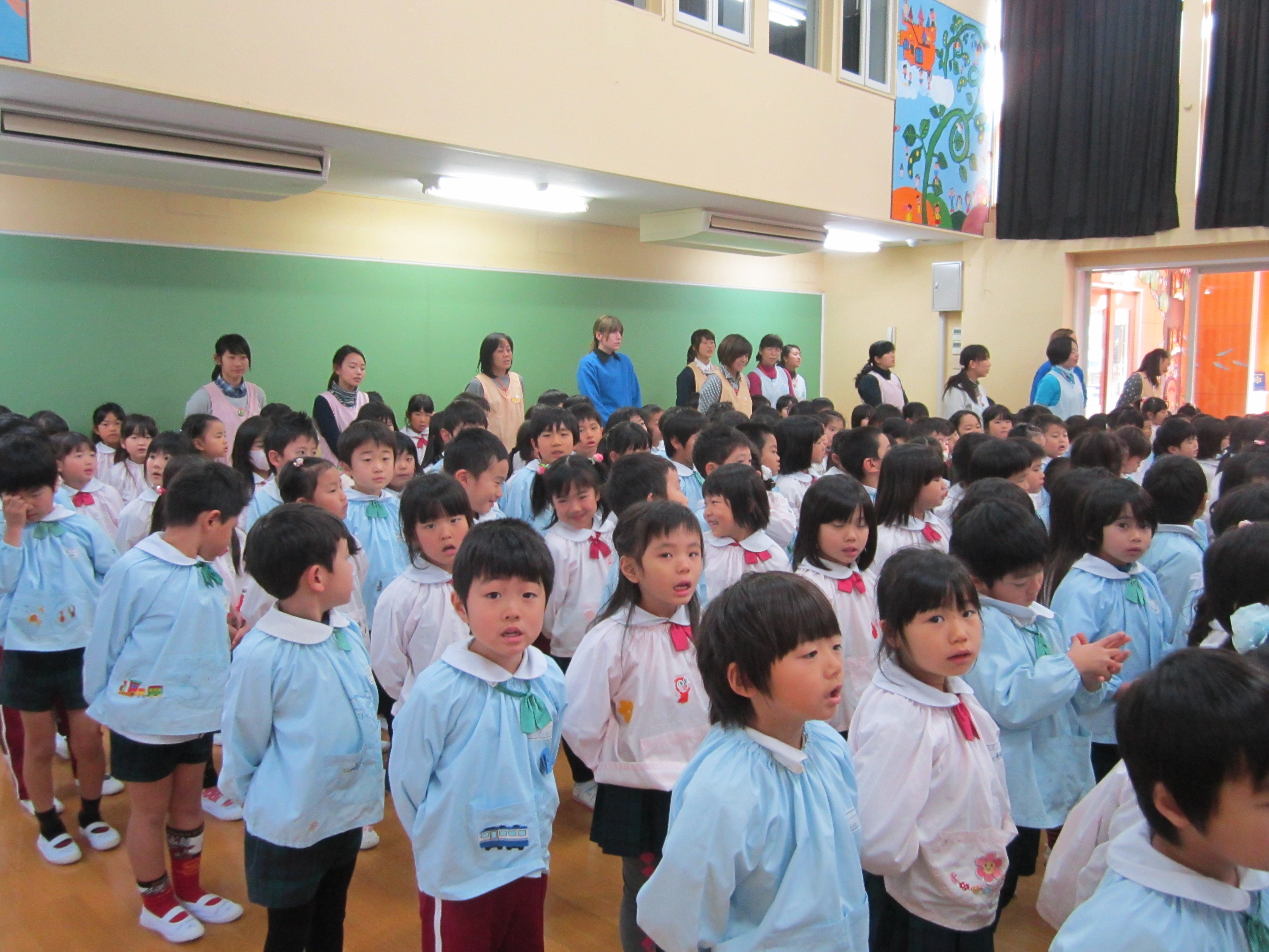 遊戯室に集まり、始業式を行いました。3学期に行う行事を聞くと、「楽しみだね」「私がんばる!」と友だちと目を輝かせて話していました。