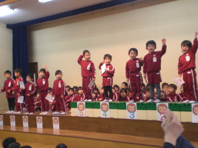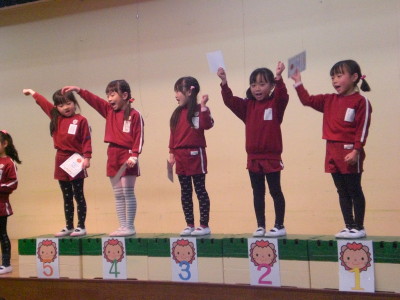 表彰式では各学年1位から10位までのお友だちをお祝いしました。入賞したお友だちは、喜びいっぱいの表情で園長先生から賞状をもらいました。