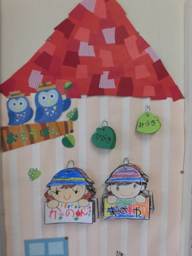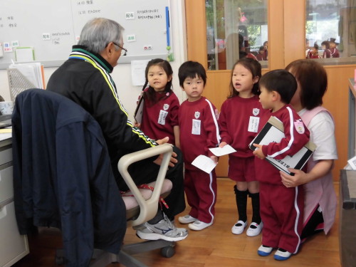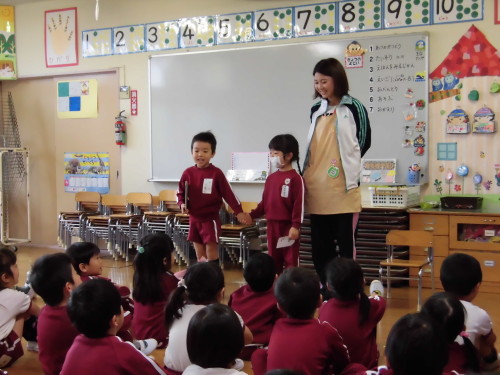 お当番さんはクラスのお休み人数を園長先生に報告したり、今日の一日の『お約束(めあて)』を聞いてみんなに伝えたりします。