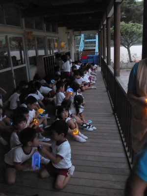 花火の後は、自分たちで就寝準備を行いました。着替えや荷物の整理、シーツを敷いたりととても上手にできました。普段とは違う夜で、嬉しかったり少しさみしそうだったり…とありましたが、友だちと一緒に寝る姿はかわいかったです。