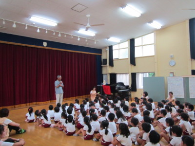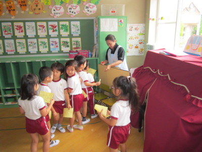 2日目は、スタンプラリーを行いました。幼稚園の中に隠れている先生を見つけ、元気に朝のごあいさつができたらスタンプをもらいます。みんな一生懸命先生たちを探してスタンプを集めていました。