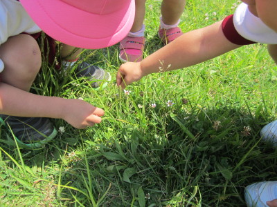 「先生お花を見つけたよ」「見て見て」と葉っぱやお花、