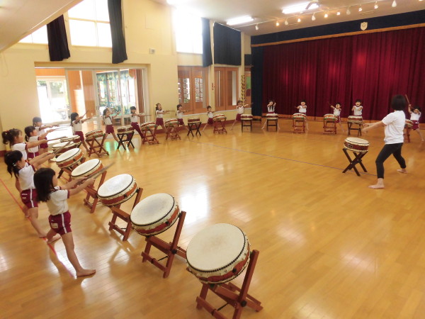 年長組の子どもたちが、10月の運動会に向けて和太鼓の練習 を始めました。