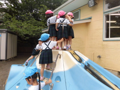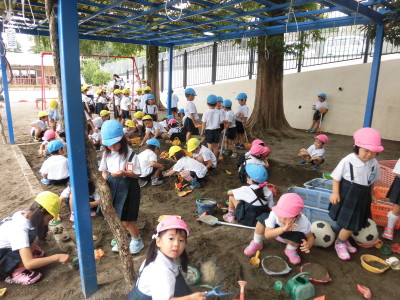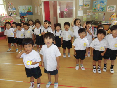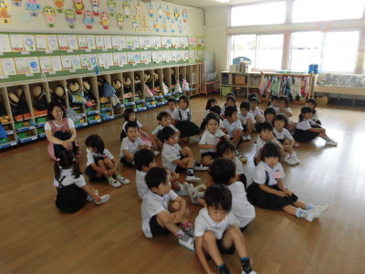 工事の関係でお遊戯室が使用できないため、各クラスで放送を聞き参加しました。きちんと体操座りをして、園長先生のお話に「ハーイ!」と返事をしている子どもたちがとてもかわいらしかったです。お部屋で園歌もうたいました。