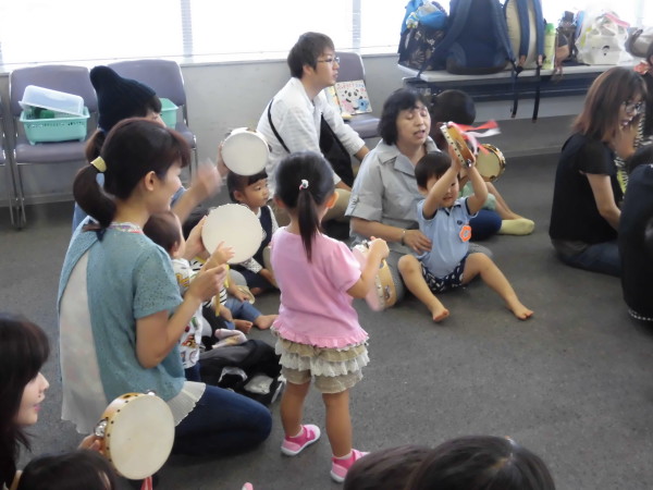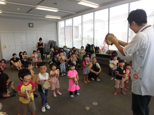 まずはみんなでタンバリンを使って楽器遊び!先生のまねっこでリズムあそびをしたり、音楽に合わせて叩いたりして遊びました。