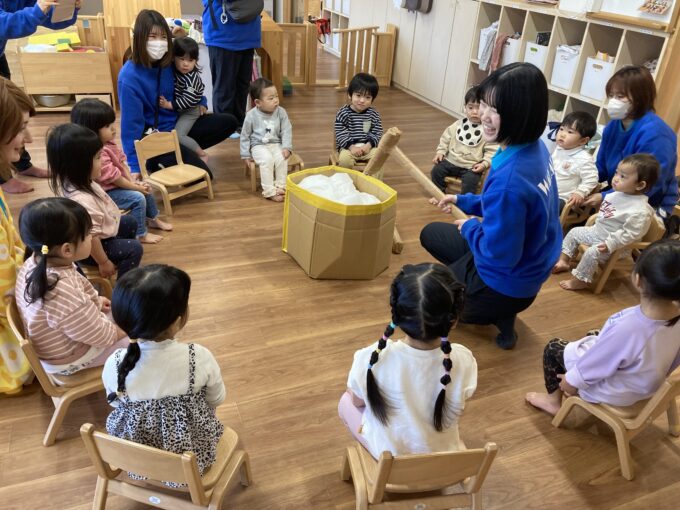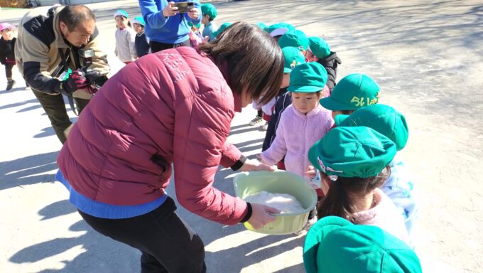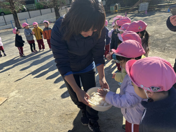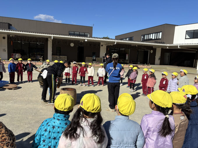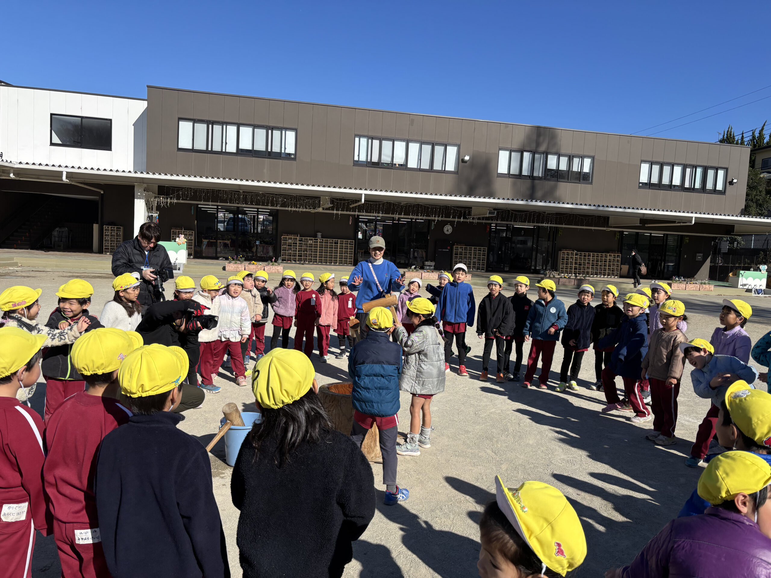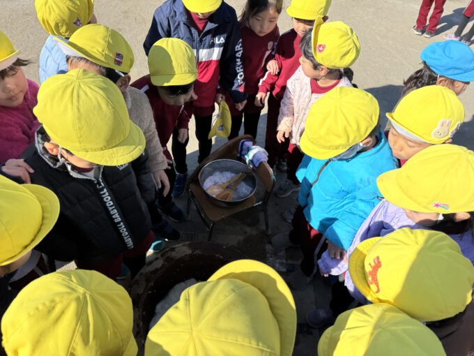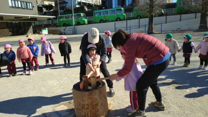 待ちに待ったお餅つき。園庭には「よいしょ!よいしょ!」と元気な声が響きました。