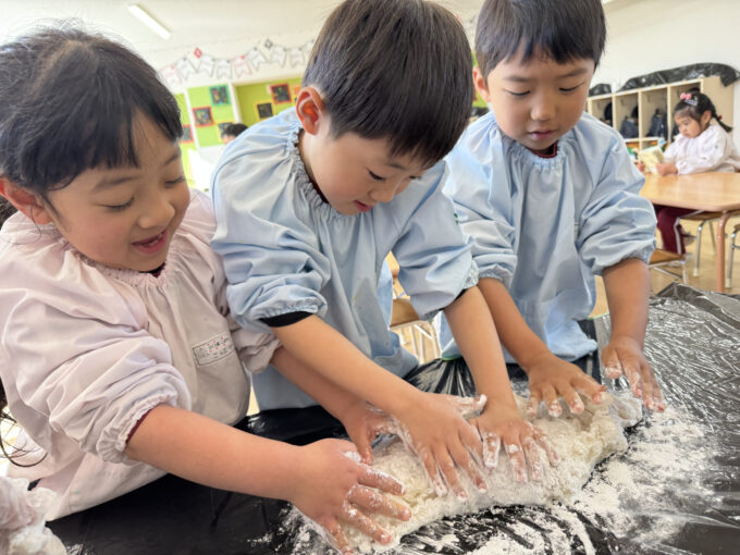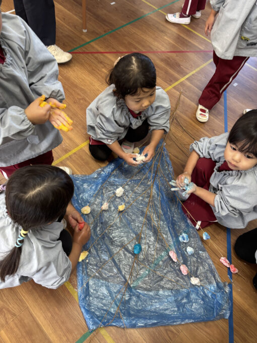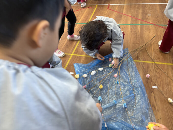 餅つきのあとは、クラスごとに「鏡餅」や、「成木(なりき)」づくりに挑戦しました。